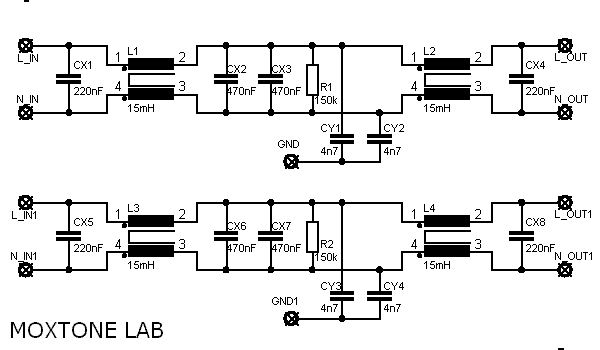 Svaki se filtar sastoji od dva serijski vezana serijska filtra. Zavojnice L1 i L2 spojene su u balansiranom-kompenzacijskom spoju, što znači da ne potiskuju simetrične struje (one koje ulaze i izlaze iz filtra jednakom vrijednošću), kakva je i naša korisna struja koja odlazi u potrošač. Za asimetrične smetnje/struje, zavojnice predstavljaju veliku impedanciju te ih prigušuju. Kondenzatori CX1-4 služe za potiskivanje simetričnih smetnji. CY kondenzatori služe za dodatno potiskivanje i simetričnih i asimetričnih VF smetnji. Njihova vrijednost ne smije, iz sigurnosnih razloga, prelaziti 4-10nF.